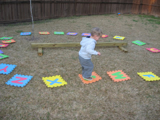 We took our letter tiles outside for Dude to hop on. He named each letter as he went and had lots of fun with this. The loop worked well ;)